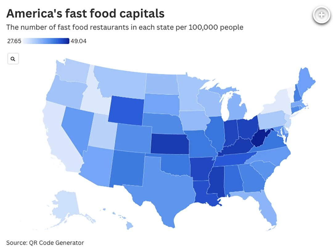 根据 QR Code Generator 公布的最新数据,研究团队将各州的快餐店数量与人口进行对比,最终得出排名。