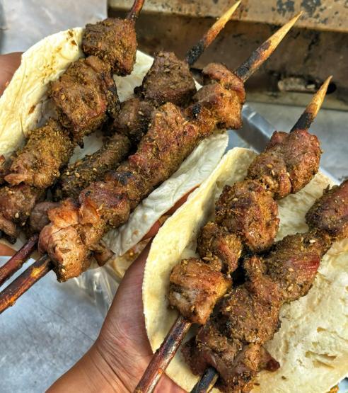 淄博的烤五花肉一绝,五花肉切片用炭火慢慢烤到焦香,肥肉冒油,瘦肉焦黄,撒上调料飘香四溢,一串才1块钱,真是难得,尤其还可以用小葱和薄饼一卷,吃一口那叫一个美味,真是味蕾的享受。